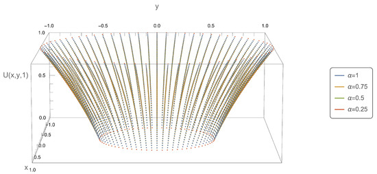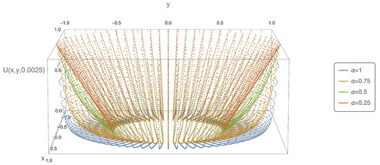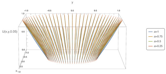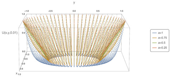 Figure 5, Figure 6, Figure 7 and Figure 8, present the axial symmetry of solution of the subdiffusion Equation (10) in the Cartesian coordinate system. Figure 1 and Figure 5, Figure 2 and Figure 6, etc. should be interpreted together, as they have been created based on the solution determined for the same time variable value. The figure with a higher number depicts the complete solution, while the figure with a lower number presents a segment of the complete solution for a fixed value of the variable . The values of the variable were determined as follows: , . The x, y coordinates were determined using the relationship , .