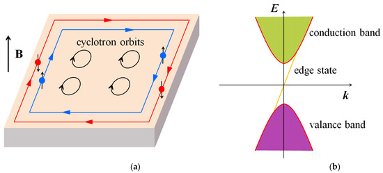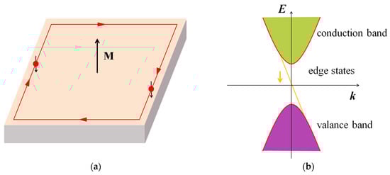 It is important to note that the aforementioned topological numbers solely rely on the properties of the bulk states, while the quantum Hall effect manifests as a boundary characteristic of a material. This unique feature is a defining aspect of topological materials, where the bulk properties dictate the conductive behavior at the boundary—a phenomenon known as the bulk-edge correspondence [2,3]. At the interface between two insulators with different Chern numbers, topological boundary states emerge and their number is equal to the difference between the two Chern numbers (Figure 1a). These boundary states enable the unimpeded propagation of electronic waves without interference from defects or impurities. Consequently, a dispersion curve appears within the band gap (Figure 1b). This topological property can be understood in terms of the breaking of time reversal symmetry by the magnetic field. Electrons can only transport in a single direction and are immune to backward scattering, even in the presence of defects or impurities, and the direction of the topological state reverses only when the direction of the magnetic field is reversed.