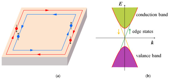 In a two-dimensional insulator with strong SOC, the SOC acts as an effective spin-dependent magnetic field, giving rise to stable conductive edge states at the material’s boundary. Notably, these edge states exhibit a spin-dependent behavior where spin-up electrons travel in one direction while spin-down electrons travel in the opposite direction. This spin-dependent motion leads to the formation of two dispersion curves within the band gap, as depicted in Figure 2. Consequently, there is a net spin transport occurring in the forward and backward directions along the upper and lower boundaries, respectively, equivalent to segregating electrons in the quantum Hall state based on their spins. This remarkable behavior is a characteristic of the quantum spin Hall effect. As long as the time reversal invariance of the system remains unaltered by the absence of a magnetic field or magnetic impurity scatterings, the influence of SOC will continue to dominate the behavior of the topological edge states.