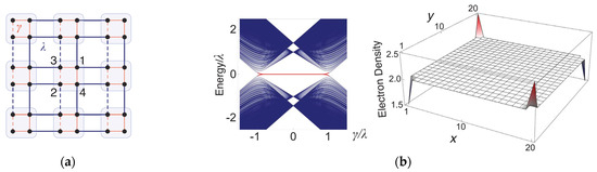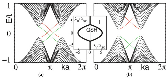 Furthermore, theoretical analyses revealed that the presence of SOC in graphene induced a small gap in the energy spectrum, resulting in an insulating bulk state and spin-dependent conductive states at the material’s boundary [22]. Figure 3a displays the energy spectrum of the quantum spin Hall phase observed in zigzag-type graphene nanoribbons, whereas Figure 3b represents the energy spectrum of the trivial phase.