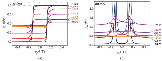 Experimental measurement results of the quantum anomalous Hall effect. The magnetic field dependence of (a) Hall resistivity and (b) longitudinal resistivity at different gate voltages at 30 mK. Reprinted with permission from [26]. Copyright 2013 American Association for the Advancement of Science.