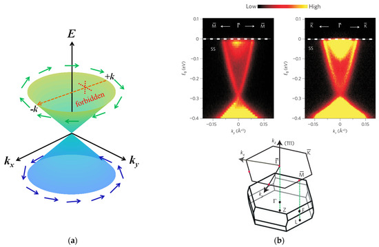 (a) The helical Dirac cone surface states of three-dimensional topological insulators. The green and blue arrows indicate the distribution of electronic spins. (b) The electronic structure of the topological insulator Bi2Se3. The top image shows the band dispersion of the (111) surface measured via angle-resolved photoelectron spectroscopy (ARPES). The bottom image shows the three-dimensional Brillouin zone and the two-dimensional projected Brillouin region for the surface. Reprinted with permission from [33]. Copyright 2009 Nature Publishing Group.