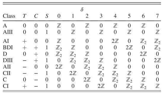 - Kitaev, A. Periodic table for topological insulators and superconductors. AIP Conf. Proc. 2009, 1134, 22–30. [Google Scholar]