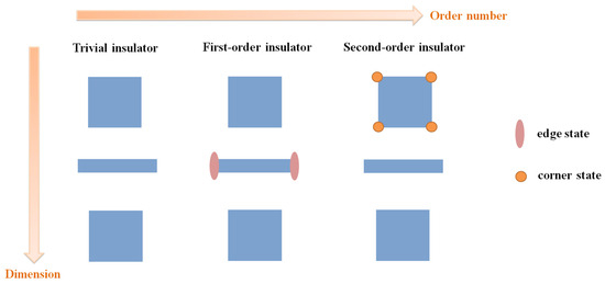 Topological insulators are known for their remarkable feature of topologically protected boundary states. According to the bulk-edge correspondence [5,124], an m-dimensional topological insulator exhibits (m−1)-dimensional gapless boundary states. However, in 2017, researchers [125,126] introduced a new class of topological insulators that break the bulk-edge correspondence, known as higher-order topological insulators. These unique insulators possess lower-dimensional boundary states. Specifically, an m-dimensional n-order topological insulator features m−1, m−2, (m−n+1)-dimensional gapped boundary states, and (m−n)-dimensional gapless boundary states. For instance, in a three-dimensional system, a second-order topological insulator displays hinge states, while a third-order topological insulator exhibits corner states. In a two-dimensional system, a second-order topological insulator will showcase zero-dimensional corner states, as illustrated in Figure 11.