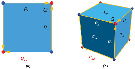 respectively, where repeated indices are summed over. Here, represents the edge tangential polarizations per unit length on the square, represents the hinge tangential polarizations per unit length on the cube, represents the surface quadrupoles per unit area of the cube, and and are the charges localized on the corners of the square and cube. The Greek letters label the surfaces of the square/cube, with outward pointing unit normal vectors where the sign encodes the direction. These properties are represented pictorially in Figure 12 [134].