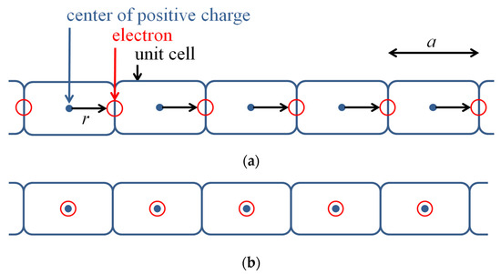 Two one-dimensional lattices with one atomic site (blue dots) and one electron (red circles) per unit cell. The electric dipole moment pi is ±e/2 in (a) and 0 in (b) due to the difference in the electron center of charge.