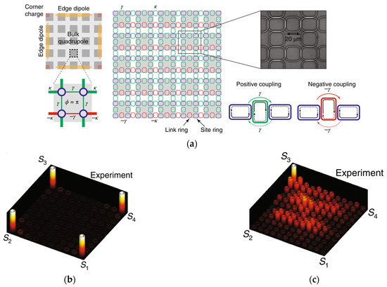 (a) Schematic of the photonic quadrupole topological system composed of ring resonators. (b) In the case of a non-zero quantized quadrupole moment, the measured spatial intensity profile shows the localized corner modes. (c) In the case of a zero quantized quadrupole moment, the measured spatial intensity profile shows the corner modes coupled into the bulk modes. Reprinted with permission from [137]. Copyright 2019 Nature Publishing Group.