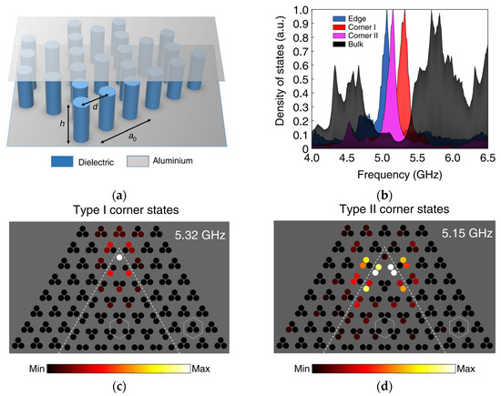 - Ni, X.; Weiner, M.; Alu, A.; Khanikaev, A.B. Observation of higher-order topological acoustic states protected by generalized chiral symmetry. Nat. Mater. 2019, 18, 113–120. [Google Scholar]