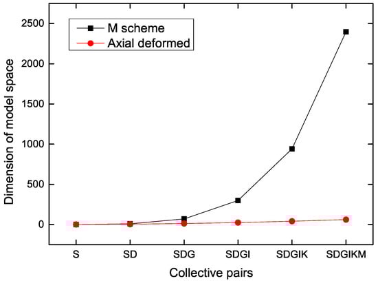 In the M-scheme, the multi-pair basis is constructed by taking the inner product of the pair operator, as given by Equation (3). In the J-scheme, on the other hand, the multi-pair basis is formed by successively coupling the pair operator to angular momentum ranging from  to J. When considering specific collective pairs, a set of multi-pair bases is constructed, and these bases depend on the pair structure coefficients associated with each pair. Such many-pair bases are non-normal and non-orthogonal, the Hamiltonian kernel and norm kernel must be transformed into a ortho-normal basis []. The matrix elements of the Hamiltonian can be carried out by using the commutator relations between collective pairs [,,,]. Finally, the Hamiltonian can be diagonalized in such a subspace, with the sum running over relatively few of the lowest-lying energies; specifically, minimizing the following average energy [].