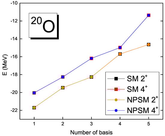The NPSM was also studied with the triaxially-deformed basis, which entails rotation symmetry breaking. In general, the symmetry is restored numerically. There are two ways to recover the rotational symmetry: variation before projection (VBP) and variation after projection (VAP). Here, the VAP method is used. The low-lying levels of the O nucleus were studied with the USDA interaction []. Only one basis is used for each level in our variation procedure. The results given in Figure 3 show that the NPSM is consistent with the SM. For example, the first  level from SM is  MeV, the one from NPSM is also  MeV,  level from the SM is the same as for the NPSM, with any difference falling outside the accuracy limitation of the computational facility that was used in the analysis.