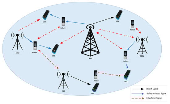 In this paper, one MBS that is outfitted with M antennas and a number of SBSs make up the model of the 6G two-tier HetNet system that has been taken into consideration. Furthermore, a number of users (U) are present, and inactive users serve as relays (R) within its scope, as shown in Figure 1. An MBS has been assigned a set of macro base station users (MUs). We focus on model development in the context of the downlink scenario, wherein the utilization of orthogonal frequency-division multiple access (OFDMA) is taken into account. Consequently, a singular macro channel is allocated to every MU at any given time. Nevertheless, the proposed study has the potential to be expanded to accommodate multiple users within a single channel. Let N = (1, 2, …, N) be a set composed of positive integers, which denote the collection of SBSs. On the other hand, SUs are a set of users that are paired with any SBS. The set U = (1, 2, …, U) denotes a set of users that are randomly distributed, while the set R = (1, 2, …, R) represents a set of idle relays, and each user is to be matched with either an MBS or SBS. The quota (Q) denotes the maximum number of users that can be allocated to a single gNB, thereby limiting the number of users associated with it. It is assumed that the quotas of distinct base stations are non-identical. The paper considers the allocation of bandwidth resources, where the total bandwidth of the system is represented by the variable W and the bandwidth splits into a set K = (1, 2, …, K) of symmetrical sub-channels. Different types of propagation issues, such as pathloss and shadowing, might affect the wireless channels. It is posited that SBSs are linked to an MBS through a backhaul connection, which may be implemented through a wired medium such as fiber.
