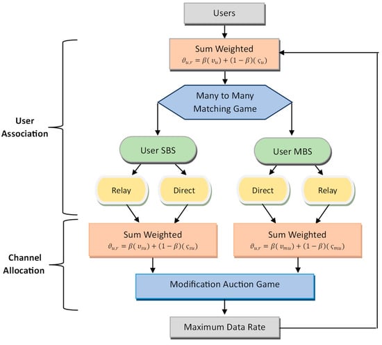 In contrast, a number of recent research papers relating to user association have incorporated matching theory as a result of its relatively low level of complexity [31,32,33,34,35]. In [31], the authors presented two frameworks that use auction games and matching theory to facilitate the efficient admission of secondary users into the HetNet. In the next step, which is a repeated modified English auction, these base stations win access to the primary spectrum that is currently accessible on behalf of their respective UAs. To allocate secondary users to multiple SBSs that are randomly distributed, a many-to-one college admissions matching game is employed. Nonetheless, the system’s energy efficiency under the suggested approach has not been taken into account. The study presented in [32] investigated a matching game for user association and identified a solution that is close to optimal. In [33], the authors presented a pair of many-to-one matching games aimed to achieve optimal association for users in both downlink and uplink scenarios. In [34], the authors propose algorithms for resource allocation in 5G HetNets that are based on stable matching and support many-to-many relationships. The objective of these algorithms is to maximize the revenue of service providers. Each service provider or resource has the freedom to construct its own preference list based on its utility function. Nevertheless, only a single framework has been taken into account in the proposed approach. In [35], the authors suggest a many-to-many matching game in order to provide the highest possible degree of dependability for the greatest number of users in multi-user and multi-cellular networks.