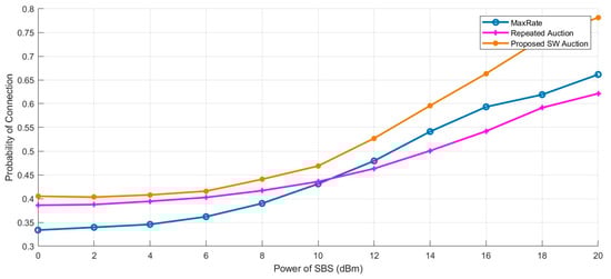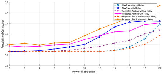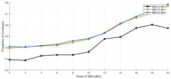In Figure 4, the outcome curve shows a higher probability of connection when setting different powers of the MBS. The probability of a connection increases with the increased power of SBSs. The users in the wireless environment will suffer high interference when the power of the MBS is 40 dBm. The probability of connection when the power of the MBS is 40 dBm, is almost the same as the probability of connection when the power of the MBS is 30 dBm. The reason is that the users of SBSs will suffer from MBS interference. For efficient power consumption, the performance of our scheme is better when the MBS power is 30 dBm. It is observed that the probability of connection for all cases ranges from 0.3 to 0.48 for SBS transmission power (0–10 dBm), while the probability of connection ranges from 0.5 to 0.79 as the SBS transmission power increases (11–20 dBm). The reason is that the SINR is directly proportional to the SBS transmission power. Hence, the probability of a connection increased.