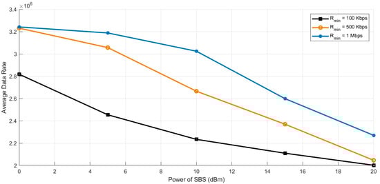 In Figure 5, the average data rate is demonstrated for various minimum QoS requirements of Rmin = 100 Kbps, 500 Kbps, and 1 Mbps. The gNB′s behavior at each level of SBS transmission power can be determined by the minimum QoS requirements of the UE. The figure illustrates that the proposed scheme can attain a superior average data rate under the condition that each user has a minimum QoS requirement of 1 Mbps. This is due to the fact that if a user has a high need for QoS, the demand may be efficiently met, which results in a large number of connected users. On the other hand, the average data rate drops when users demand a minimum QoS of 100 Kbps. The reason is that the number of connected users is high with a low data rate. Obviously, when the minimum QoS requirement is between 100 Kbps and 500 Kbps, the average data rate is nearly the same for a SBS with a 20 dBm transmission power. The reason is that the users suffer from severe interference due to the high number of connected users.