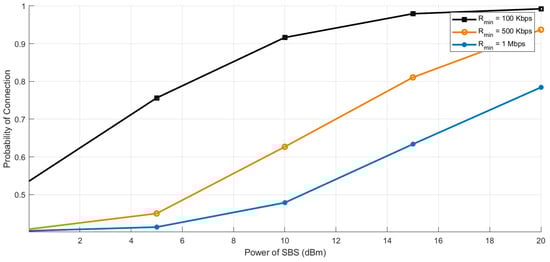 Figure 6 shows the probability of connection attained by the presented scheme with different minimum QoS requirements. As can be observed from the figure, the proposed scheme achieves full connection when each user has a minimum QoS need of 100 kbps and 20 dBm of SBS transmission power. On the other hand, if a gNB has a greater need for the QoS requirement, it would be difficult to meet the demand, which would result in a large number of users being in a non-connection status. It was noted that the probability of connection is very low when the SBS transmission power ranges from 0–10 dBm and the minimum QoS is 1 Mbps. The reason is that the user cannot satisfy the gNB requirements.