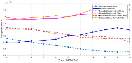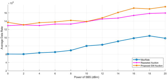 Figure 8 presents the average data rate of all users against the transmission power of the SBS in a relay-assisted scenario. The proposed scheme yields improved downlink network throughput outcomes through the increase in the transmission power of the SBSs. As a consequence, it provides optimal system performance in the context of repeated auctions and maximum rate solutions, which experience reduced performance as a result of network congestion and interference effects. The reason for this is attributed to the downlink utility functions, which mainly consider user rates. While our proposed scheme takes into account the sum-weighted strategies of the EE and SE and the severe interference resulting from channel reuse, it outperforms the current scheme in terms of average data rate. Compared with the maximum rate scheme, the proposed scheme has a 30.23% performance gain when the power of the SBS = 10 dBm and a 42.76% performance gain when the power of the SBS = 20 dBm.