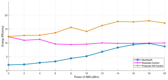 Figure 9 illustrates the energy efficiency of our proposed scheme at various levels of transmitted power for the SBSs with respect to the repeated auction and maximum rate schemes. It is clear that the energy efficiency of the proposed scheme is better than that of the repeated auction and maximum rate schemes. The figure shows that energy efficiency increases with the increase in power of the SBSs. One reason is that the transmission power of the SBSs will be shared by more users in our proposed scheme. Consequently, the ratio of the average data rate to the consumed power increased. It is also seen that, compared with the current scheme, the proposed scheme has a 40.51% performance gain when the power of the SBS = 1 dBm and a 33.93% performance gain when the power of the SBS = 20 dBm.