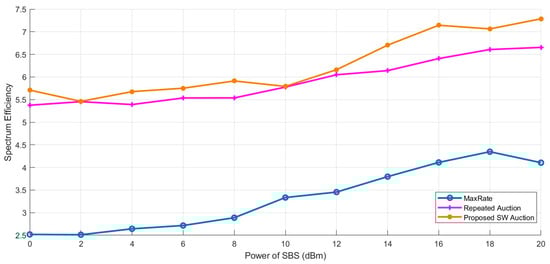 Figure 10 shows the spectrum efficiency of our proposed scheme compared to the repeated auction and maximum rate schemes at various levels of transmitted power for the SBSs. As seen in Figure 10, the spectrum efficiency of the proposed scheme outperforms the current schemes. We can observe that the proposed scheme achieves SE closing compared to the repeated auction scheme with a small performance gain. The conventional maximum rate scheme is not ideal because of unreliable channel reuse. Furthermore, when the transmission power of the SBSs increases, the performance gap of the repeated auction scheme becomes larger. This superior performance further demonstrates the effectiveness of the proposed scheme. Compared with the repeated auction, the proposed scheme has a 24.89% performance gain when the power of the SBS = 10 dBm and a 37.51% performance gain when the power of the SBS = 20 dBm.