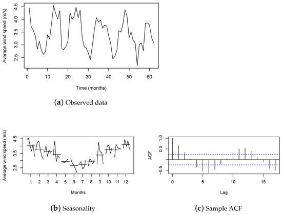In Brazil, one of the places considered to have the greatest wind energy potential is the country’s southern region. To illustrate the applicability of the proposed model, we developed an application for wind-speed data from a city in Rio Grande do Sul (RS) estate. Here, we utilized the average wind-speed data (or simply wind speed, abbreviated WS) obtained from the city of Rio Grande, which was sourced from the Instituto Nacional de Meteorologia (INMET—Brazilian National Institute of Meteorological Research), available on INMET’s website (https://bdmep.inmet.gov.br/, (accessed on 17 July 2022)). The dataset comprised the period from December 2009 to January 2016, with 74 monthly observations. This time period was selected in order to have as large a sample size as possible without missing any values in the time series. The last 12 observations were reserved only for the purpose of comparing forecasting results, where the first observations were used for estimation. However, 2 of the last 12 observations, which correspond to the months of February and March 2015, were missing, and so the fitted models were used to input these 2 missing values. Then, the time series used in the estimation considered the period from December 2009 to January 2015 and showed an average monthly speed of m/s and a median of m/s, with the maximum average speed reaching m/s and the minimum being at m/s. Figure 2 presents some graphs of the time series under study. Figure 2a shows the time series, while Figure 2b evidences the seasonal pattern in the data; the sample auto-correlation function (ACF) is shown in Figure 2c. It is evident from the analysis that seasonality is present in the data. During the winter months, the WS tends to be generally lower compared to its level in the summer months.
