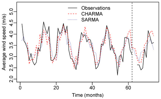 In Table 4, the observed and out-of-sample predicted values from the CHARMA and SARMA models are presented. It can be observed that the CHARMA model produces predictions that are close to the observed values of WS in five of the ten observations with recorded values. To further evaluate the predictive performance of the models, we calculated the MAPE% and the MSE between the observed and the fitted values. The results of these figure-of-merit measurements are presented in Table 5. It can be noted that the CHARMA model has the best performance in modeling the WS. When both measurements are considered, the selected model demonstrates the lowest values, indicating that it is the most suitable approach for modeling the WS dataset in the city of Rio Grande in the period from December 2009 to January 2016.