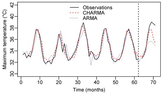 Observed and forecast MT values for the CHARMA and ARMA fitted models.