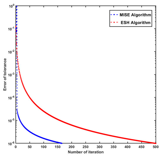 Next, we present the comparison of the proposed MISE Algorithm and the extragradient subgradient Halpern method (shortly, ESH Algorithm) [23]. We consider Problem (38) in the case of the number of systems, N = 1 . We tested the example with the dimension n = 50 , 100 , and the matrices P and Q are the matrices of W and V, respectively, being randomly generated in the interval [ 5 , 5 ] . The matrix A = ( a l s ) , where a l s are randomly generated in C. The parameters are defined as follows: