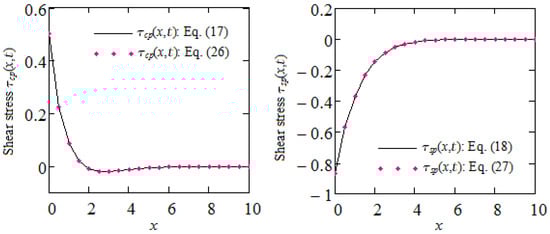 Diagrams of shear stresses and given by Equations (17), (26) and (18), (27), respectively, for and .