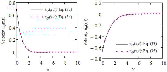 have been obtained by introducing and from the relations (26) and (27) in Equation (8). Simple computations show that and given by Equations (34) and (35) satisfy all governing Equations (8), (9) and (14). The equivalence of the expressions of and given by Equations (32), (34) and (33), (35), respectively, has been proved by means of Figure 2. Furthermore, it’s readily noticeable that the dimensionless permanent solutions, which correspond to identical movements of IGBFs when magnetic influences are absent, can be directly derived by setting in the overall solutions. These solutions, along with the previously mentioned ones, are new contributions within the existing body of literature.