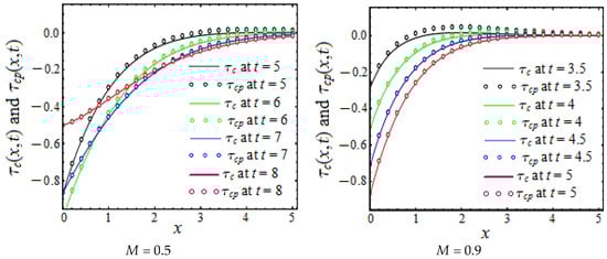 From these graphical illustrations, which have been generated for two different values of the magnetic parameter M, it can be inferred that the time required to attain the permanent state diminishes as the magnetic parameter M increases. Consequently, the presence of a magnetic field leads to an earlier achievement of the permanent state for these unsteady motions of IGBFs. In addition, the required time to touch the permanent state for motions due to sine oscillations is shorter than that for cosine oscillations of shear stress on the boundary.