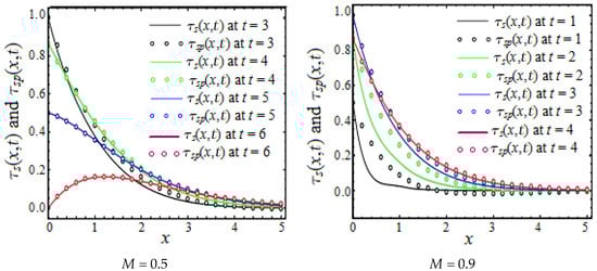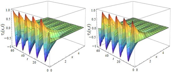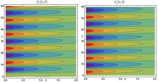 Finally, for comparison, the spatial profiles of the dimensionless starting shear stresses and (numerical solutions) are depicted adjoining in Figure 7 for and . As before, the oscillatory behavior and the phase difference between the two motions are easily observed and the initial and boundary conditions are clearly satisfied. The three-dimensional pattern of the initial shear stresses for both cases is also depicted using two-dimensional contour plots [] in Figure 8. This visualization is based on the same set of physical parameter values. Different colors are used to indicate their trajectories. The red and purple colors are used to bring to light the solutions’ maximum and minimum values, respectively. The oscillatory behavior of the solutions is indicated by the alternation of two distinct sets of almost closed trajectories throughout the time t. The increasing values of x lead to a decrease in the oscillation amplitude.