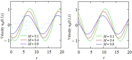 Now, in order to bring to light some characteristics of the fluid motion, Figure 5 and Figure 6 have been included here. Figure 5, which presents the time variations of the permanent velocities and at the middle of the channel for increasing values of the magnetic parameter M, shows that the oscillations’ amplitude decreases in the presence of a magnetic field. Moreover, the oscillatory characteristic feature of the two movements, along with the phase discrepancy between them, can be readily noticed.