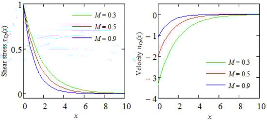 Configurations of the permanent shear stress and velocity fields and given by Equations (55) and (56), respectively, for three values of M.