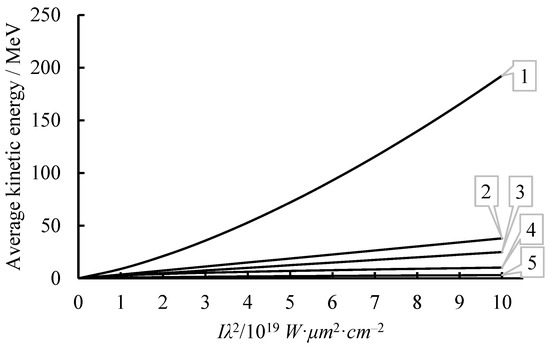 Figure 2 compares the kinetic energies of an electron from Equations (111) and (116). An analytic calculation from the Landau and Lifshitz method [24] gives the kinetic energy of a particle in the non-relativistic case as . The formula estimates the kinetic energy of electrons on the frontal surface of a target in a field of an intense circularly polarized electromagnetic wave [39], where the rest energy of the electron is MeV. All formulas are given by considering the normalization of the wave field amplitude .