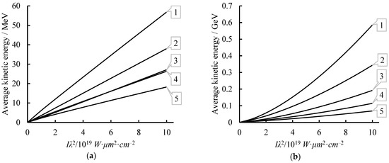 To describe the particle dynamics in the ultra-relativistic regime, it is necessary to consider the dimensionless field amplitude a as a dynamic parameter . This is demonstrated in Equations (112)–(116) and describes the particle dynamics in the non-relativistic, sub-relativistic, and ultra-relativistic regimes well. Figure 1 shows that the increased electromagnetic field intensity also increases the kinetic energy. For example, a field intensity that reaches 1020 W/cm2 gives kinetic energies for the plane wave model and spatially modulated wave model of 400 and 500 MeV, respectively.