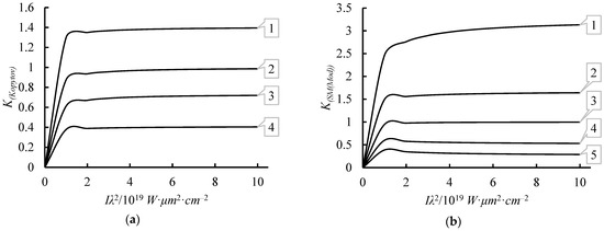 The frequency deviation and modulation depth are defined as the ratio of the kinetic energy to the total energy in the absence of modulation (see definitions of and in reference [44]). Figure 3 plots the dependence of the kinetic energy of a particle on the intensity of the modulated electromagnetic field. Due to the relatively small amplitudes for the lateral modes of the wave, only K and N values of approximately 5 are considered.