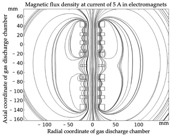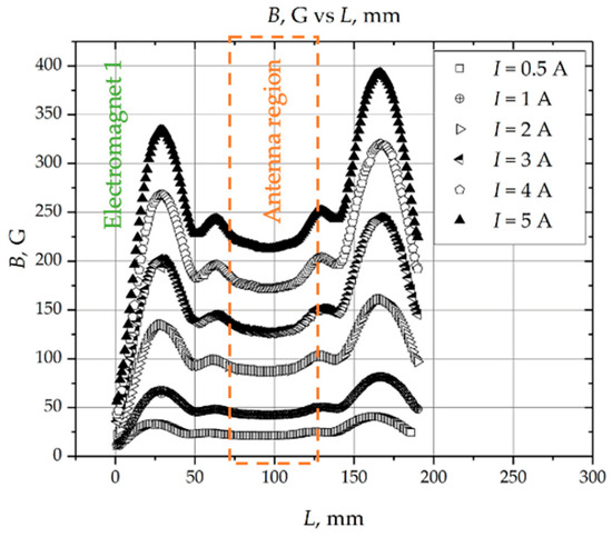 In this study, there is no change in the configuration of the static magnetic field, but there is a change in the magnitude of the field. In the experiments, all the electromagnets are supplied with the same current in the range of 0.5–5 A. The current direction is the same for electromagnets 2–13. The current direction in electromagnet 1 is opposite to the current direction that is in electromagnets 2–13. The set of electromagnets is connected to the power supply with shielded cables. The electromagnets are connected independently, which makes it possible to adjust the current and the current direction for each electromagnet. The measured magnetic field profile along the gas discharge chamber of the thruster and the simulated 2D distribution of the magnetic flux density at a current of 5 A in the electromagnets are shown in Figure 2 and Figure 3, respectively. The magnetic field measurements (the data are shown in Figure 2) are made using the AlphaLab GM2 gaussmeter. The simulated data shown in Figure 3 were generated using COMSOL Multiphysics. The electromagnets in the simulation are their 3D representation. The electromagnets in the simulation are filled with the real number of cable turns. The current is set to 5 A. The result is obtained by selecting the Magnetic flux density function in the simulation tool.
