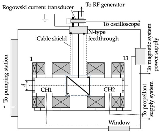 In this experiment, the RF gas discharge is ignited in the krypton gas. In the experiments, the propellant supply to the thruster is provided through a CH1 gas inlet located 45 mm from the electromagnet with the opposite current direction.