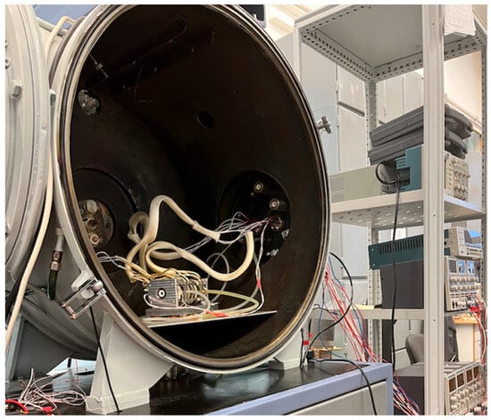 The test bench consists of a horizontal cylindrical stainless steel vacuum chamber 700 mm in diameter and 500 mm in length (see Figure 5). A bypass scheme is used for vacuum pumping of the stand. The high-vacuum pump is the Oerlikon Leybold Vacuum TURBOVAC MAG W 3200 CT turbomolecular pump with a nominal pumping speed of 3.2 m3·s−1. Forevacuum pumping and maintenance of the turbomolecular pump operation is carried out using the Oerlikon Leybold Vacuum TRIVAC D 65 B rotary vane pump with a pumping speed of 18 L·s−1. The residual pressure in the vacuum chamber is measured with a combined vacuum meter (MKS Instruments DualMag 972B). The working pressure is measured with a capacitive absolute pressure vacuum meter (MKS Instruments 627D), whose readings are independent of gas type and mixture composition. The mass flow rate is controlled by the MKS GE50 mass flow controllers. The pumping station is controlled by an industrial computer and the Siemens S7 programmable logic controller.