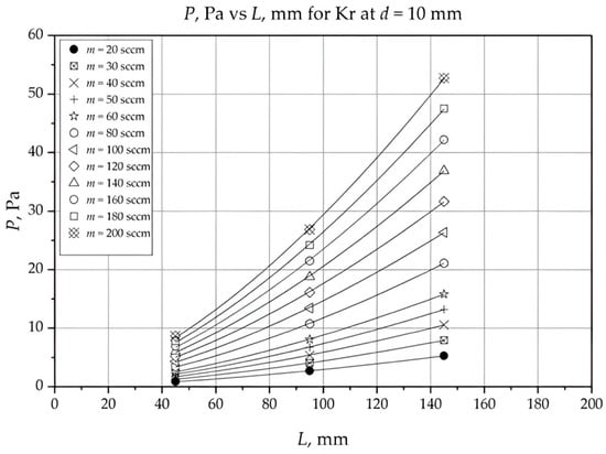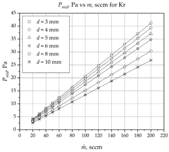 The calculated pressure dependence of the propellant flow rate inside the gas discharge chamber in the center region of the antenna for different inner diameters of the orifices is shown in Figure 8. The pressures shown in Figure 8 can be used as a reference to determine the mass-flow-rate-dependent pressure at which the discharge is considered ignited.