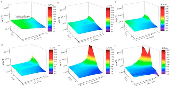 The starting modes are above the threshold surfaces (Figure 10). For the conditions considered, the electric breakdown field, , is in the range of 440 to 2400 V/m. The minimum breakdown field is reached at = 10 mm, a propellant flow rate of 20 sccm, and a magnetic field corresponding to 5 A (400 G in a peak). For the remaining conditions, the minimum field is about 750 V/m. It can be seen that for all conditions considered, the minimum breakdown field is in the region of the minimum propellant flow rate (20 sccm) and the maximum magnetic field (corresponding to 5 A).