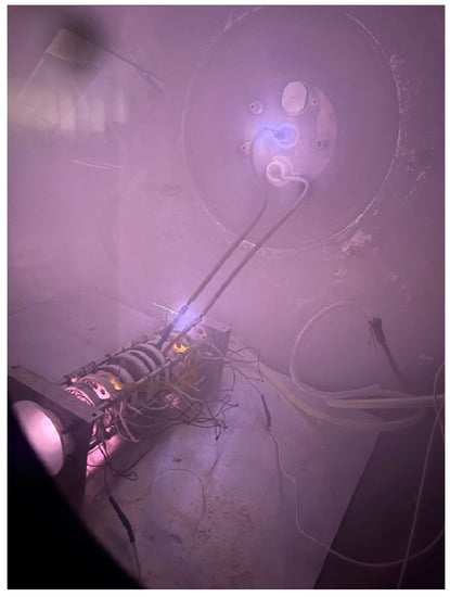 The technique for recording magnetically enhanced RF breakdown curves is as follows. First, a certain amount of propellant in the range of 20 sccm to 200 sccm is supplied to the chamber through the inlet CH1, which is closer to the magnetic nozzle with the opposite magnetic field directions of the electromagnets. Then, the power level of the RF generator is set and is slowly increased. At this moment, the current transducer readings are recorded by the oscilloscope. At the moment when the radiofrequency current measured by the current transducer changes sharply, the power increase is stopped and the recorded values of the current transducer are stored. The sharp change in the current indicates that the conductivity of the medium inside the antenna is changed, which is caused by the ignition and glow of the discharge. At this point, the discharge can be seen through the window of the vacuum chamber (see Figure 9).
