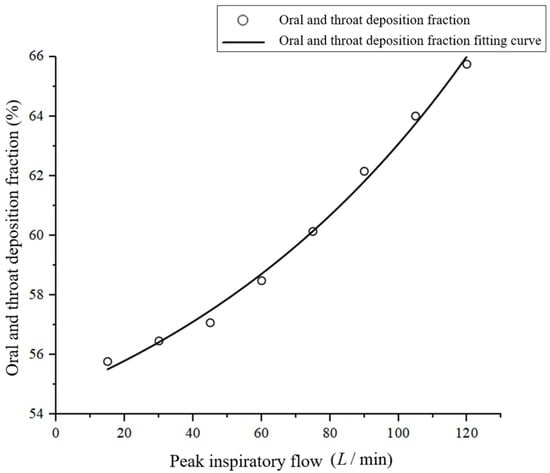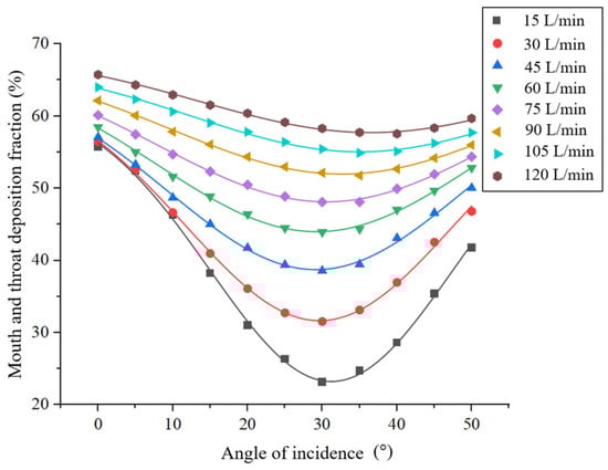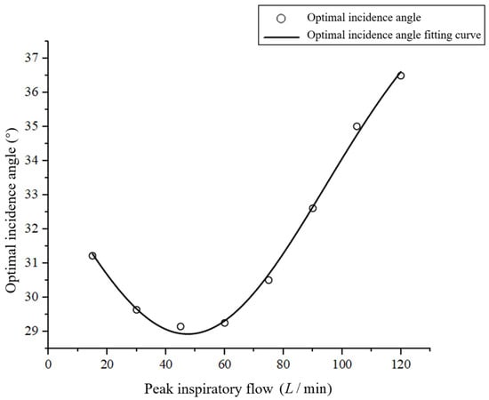 - When the peak inspiratory flow remained constant, the deposition fraction of drug particles in the mouth and throat first decreased and then increased as the incidence angle increased. Thus, there existed certain optimal incidence angles corresponding to the lowest deposition fractions at different peak inspiratory flows;