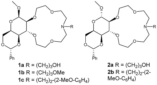 Methyl 4,6-O-benzylidene-β-d- (1a–c) and methyl 4,6-O-benzylidene-α-d-idopyranoside-based (2a–b) monoaza-15-crown-5 lariat ethers.
