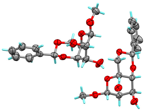 During the synthetic work, idose derivative 6 was obtained as a solid. After a few attempts, suitable-sized crystals were obtained, which were subjected to X-ray diffraction analysis in order to determine their absolute configuration. Interestingly, it was found that two independent molecules are present within the asymmetric unit. These two molecules differ slightly in their conformation within the phenyl rings. The ORTEP representation of idose derivative 6 can be seen in Figure 2. X-ray measurement proved that the configuration of C-2 and C-3 is the opposite of those in d-galactose, justifying the idopyranoside structure. For more information see the Supplementary Materials.