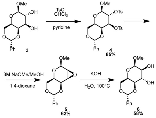 The free hydroxy groups in galactopyranoside 3 were then subjected to excess tosyl chloride in chloroform/pyridine, resulting in 2,3-ditosylate 4 in an 85% yield (Scheme 1) [27]. Compound 4 was then reacted with a 3 M sodium methoxide/methanol solution in dry 1,4-dioxane to facilitate the formation of an oxirane ring at positions 2 and 3 [28]. According to the literature, this reaction proceeds with an intramolecular SN2 mechanism [29]: The reaction starts with the cleavage of an S-O bond in one of the sulfonic ester groups resulting in an oxyanion, which can then directly attack the neighboring carbon atom. Since there is still another tosylate group attached to this atom, which is a good leaving group, the formation of the oxirane ring is allowed. Basically, the new ring could form in two possible configurations, but in the case of the β anomer, only one stereoisomer, the talo configuration, was observed. Crystallization of the crude anhydro sugar from methanol provided methyl-2,3-anhydro-4,6-O-benzylidene-β-d-talopyranoside (5) in a 62% yield.