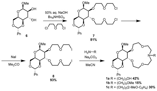 In the next reaction anhydro talopyranoside 5 was boiled in 2 M KOH for 22 h to allow the ring opening to occur, yielding selectively methyl-4,6-O-benzylidene-β-d-idopyranoside (6) (58%) in accordance with the Fürst–Plattner rule (Scheme 1). After the synthesis of this compound, macrocyclization was carried out in three steps, a well-tried sequence in our research group. First, compound 6 was O-alkylated with bis(2-chloroethyl) ether under phase-transfer conditions, providing bischloro podand 7 in an 81% yield. Bischloro derivative 7 was then activated via halogen exchange using anhydrous sodium iodide in dry acetone. Bisiodo compound 8 was prepared in a 93% yield, which–in the last step—reacted with the corresponding primary amine, resulting in the monoaza 15-crown-5 ethers 1a–c, as shown in Scheme 2.