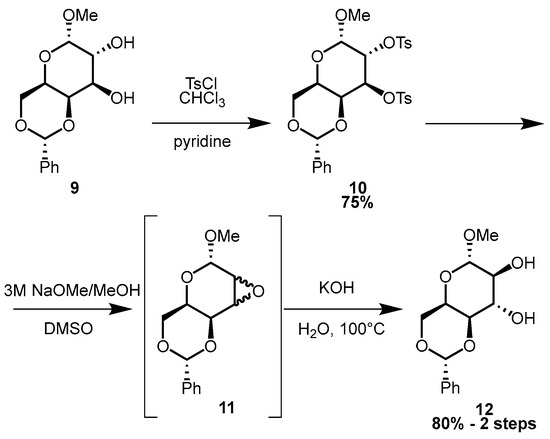 Ditosylate 10 (20.11 g, 34 mmol) was dissolved in dry dimethyl sulfoxide (320 mL), and then 60 mL of freshly prepared 3 M NaOMe solution in MeOH was added by stirring. The reaction mixture was allowed to react for 5 h, and then it was poured into 1 L of ice water while stirring. After some time, a beige solid precipitated which was filtered. This was a mixture of methyl 4,6-O-benzylidene-2,3-anhydro-d-gulopyranoside and methyl 4,6-O-benzylidene-2,3-anhydro-d-talopyranodside and was used in the next step without purification.