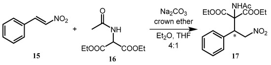 The first of the solid–liquid reactions to discuss is the Michael–addition of diethyl acetamidomalonate (16) to trans-β-nitrostyrene (15) (Scheme 5).