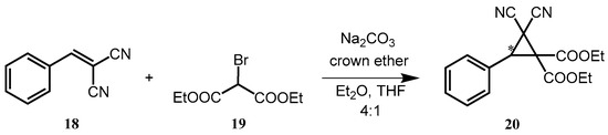 Another solid–liquid reaction, the cyclopropanation of benzylidenemalononitrile (18) was examined in the presence of crown ethers 1a–c and 2a–b (Scheme 6). The reaction takes place according to a Michael-initiated ring closure (MIRC) mechanism, where diethyl bromomalonate (19) is first deprotonated by a base, after which the Michael-addition occurs. The reaction is then finished with a ring closure and the elimination of the leaving group (Br−).