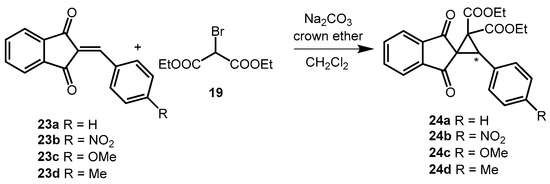 Next, the MIRC reaction between 2-benzylidene-indane-1,3-dione (23a) and diethyl bromomalonate (19) was inspected (Scheme 8). The product of this reaction (24a) is also noteworthy because it is a chiral spiro compound with reactive groups attached.